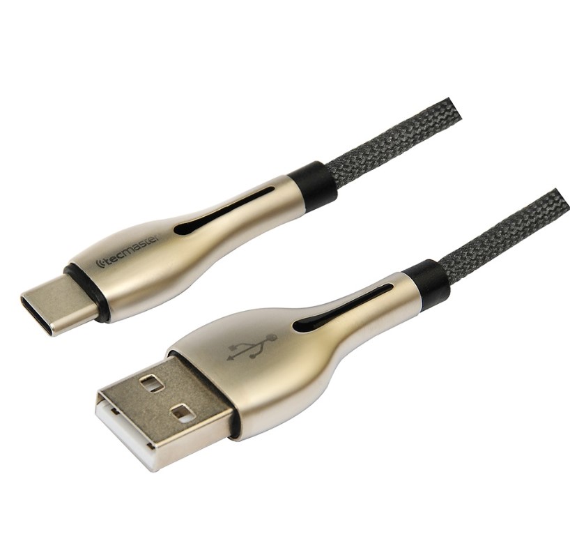 El cable Tecmaster Tipo-C a USB con recubrimiento en nylon trenzado y conectores en aleación de zinc está diseñado para máxima resistencia. Soporta carga rápida y transmisión de datos estable, con una presentación de empaque que optimiza su protección y exhibición en vitrinas.