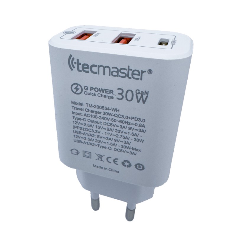 El cargador de pared Tecmaster 30W con tecnología GaN combina potencia, seguridad y eficiencia en un diseño compacto. Su capacidad de alimentar varios dispositivos al mismo tiempo lo hace ideal para viajes y uso en oficina. El cable incluido ofrece comodidad inmediata para equipos compatibles.